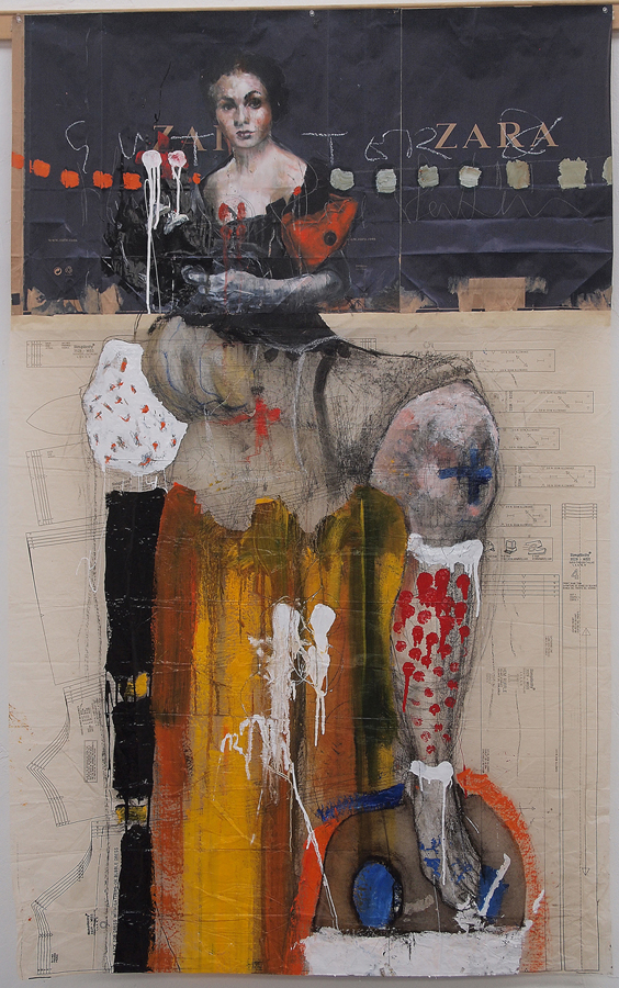 ”Snipe - with the Head of John the Baptist” - oil on dress pattern & Zara bags 200cm x 116cm