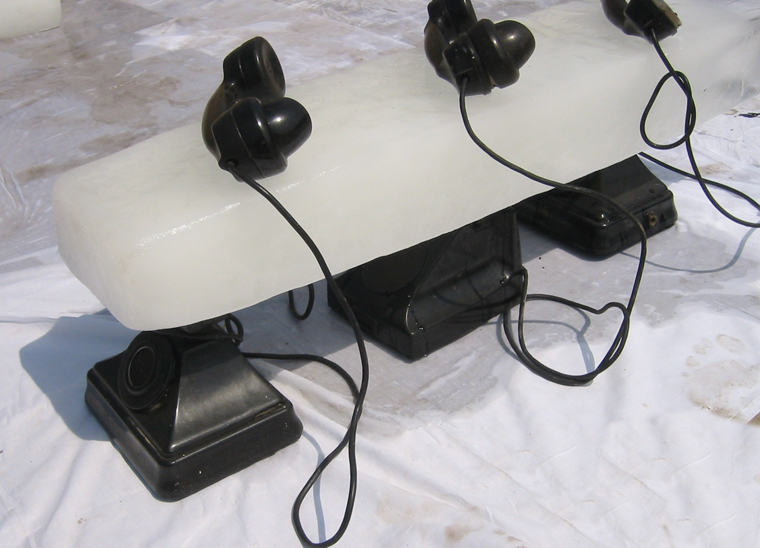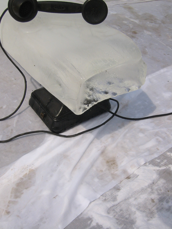 Watching Al Jazeera News, the same streets, now filled with everyone. There was a shot of the protesters, thousands of them, at the sunset prayers, just before the curfew was to set in, stopping their demonstrating and as a lined mass performing their prayers. Proper interventions in the street. This sculpture, this ice on telephones, just emanated a new set of meanings, just taken on a new life.