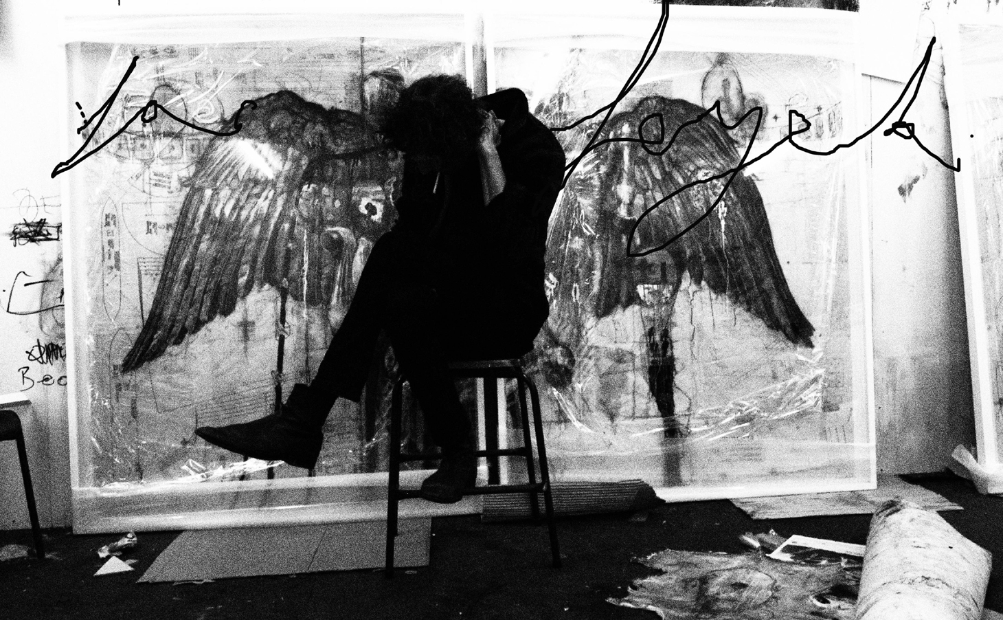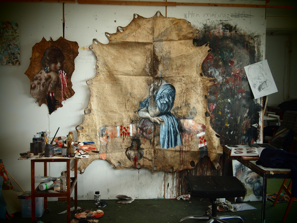 Addis Ababa, Ethiopia: I went and got a studio there for three months. Goat and cow hides – a fabric of daily life there replaced dress pattern paper as a canvas. It felt pre-ordained as a material, I had been drawing in the tribal villages of the south and the glistening hides would be staked out in the sun – like some Mappa Mundi with continents of gristle, rivers of veins. Everyone in the village knew why I might want them, and what their worth was in a trade for matches/soap and razor blades.