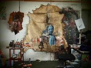 The cow hides are immense, 2 metres square. Blank cow hides stacked in the Cornwall studio. Finding sources for paintings in Ethiopia was like shooting fish in barrels, sketchbooks filled with the work to be done, plus a culture that permeated the membrane of my dreams, that bodily taste that I have been immersed in something tangibly squalid and beautiful at the same time.
